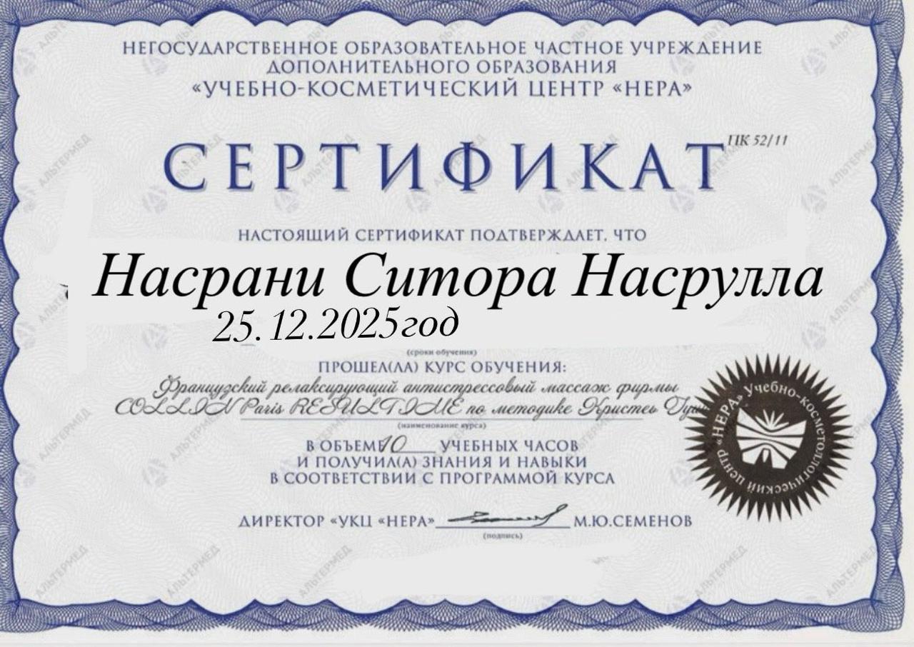 Certified by the NERA Educational Center, Sitora has completed specialized training in French Anti-Stress Massage techniques.